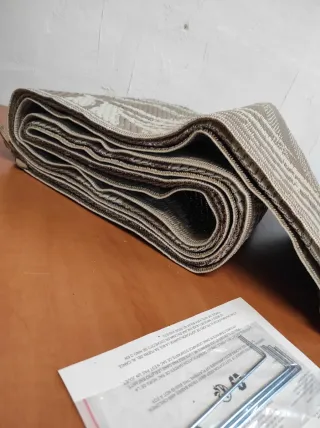 Alfombra de tela con un diseño moderno y elegante. - Tonos marrones y beige. - Patrones geométricos y florales sutiles. - Ideal para añadir un toque de estilo a cualquier habitación.