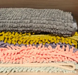 Conjunto de alfombras de diferentes colores, ideales para jaulas de cobayas o hurones. Son suaves y absorbentes. - Textura mullida y agradable al tacto. - Fácil de lavar y mantener. - Variedad de colores y medidas para elegir. - Precio entre 2,50€ las alfombras de baño grandes 65x50cm -Precio 1€ las de flecos yaq la base esta estropeada de las lavadas xo son absorbentes y les gusta mucho a las cobayas para dormir 54x36cm