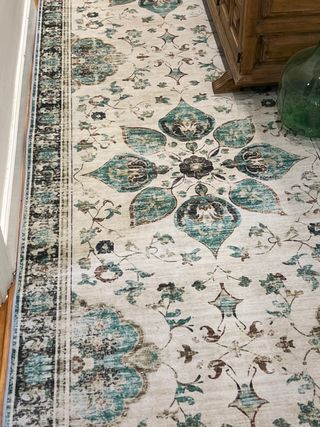 Alfombra de pasillo con un diseño intrincado y colores que aportan calidez a tu hogar. Su tamaño la hace ideal para recibidores o pasillos largos. - Diseño floral y damasco. - Tonos beige y verde azulado. - Borde decorativo.