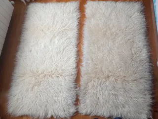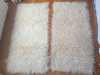 Tres alfombras de pura lana virgen, perfectas para añadir calidez a tu hogar. Su textura suave y natural las hace ideales para cualquier estancia. - Hechas de lana virgen. - Color beige y blanco. - Origen Nueva Zelanda Medidas: Son dos de 150 cm x 75 cm aproximadamente y una de 125 cm x 65 cm aproximadamente. Están prácticamente sin usar, nuevas y limpias. Se pueden vender por separado o el pack que tú elijas