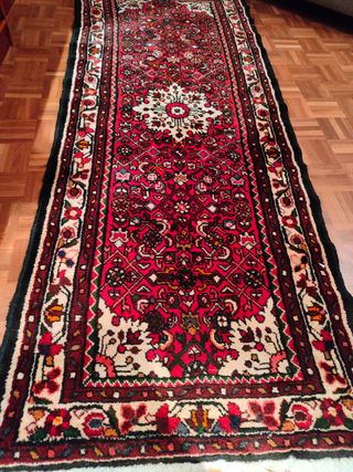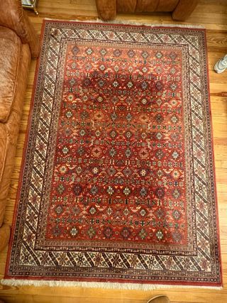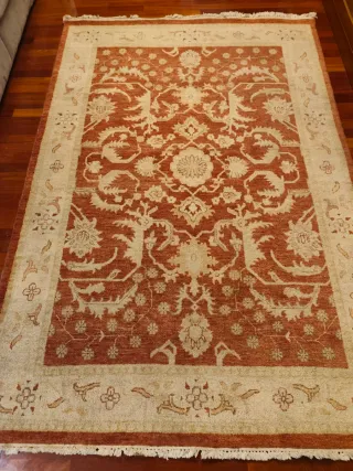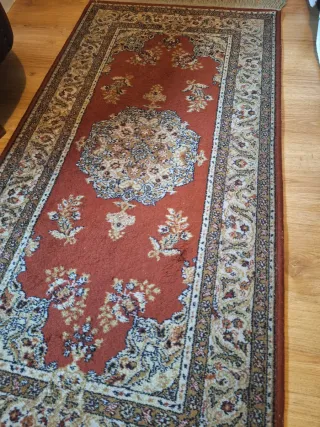 Vendo elegante alfombra de gran tamaño para salón o comedor, con diseño clásico de estilo oriental/persa. Detalles: Dimensiones: 240 cm x 170 cm (Tamaño estándar ideal para cubrir la zona de sofás o bajo una mesa de comedor de 6 sillas). Diseño: Patrón de medallón central con motivos florales intrincados (estilo Tabriz/Kashan). Colores: Fondo predominante en rojo granate/burdeos con detalles en azul marino, crema y beige. Muy sufrida (disimula muy bien el uso). Estado: En muy buen estado de conservación. Los colores se mantienen vivos y los flecos están completos y cuidados. Proviene de una casa de no fumadores.