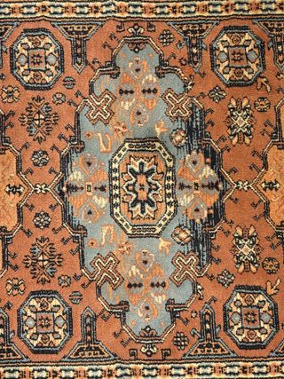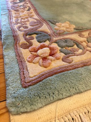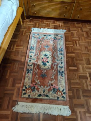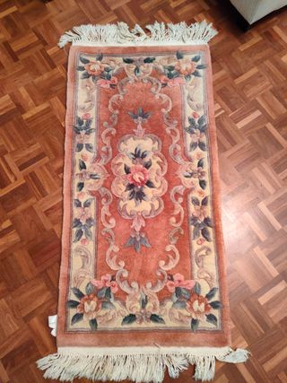 Vendo alfombra de estilo oriental chino, hecha de pura lana con diseño tallado en relieve. Ideal como pie de cama o para pasillo pequeño. Características: Medidas: 127 cm x 60 cm. Estilo: Vintage años 80/90, lana gruesa y mullida de alta calidad (Super China). Diseño: Fondo color salmón/rosa suave con flores esculpidas en tonos pastel y cenefa beige. Estado: Buen estado general, lana limpia y suave. Flecos originales de algodón.