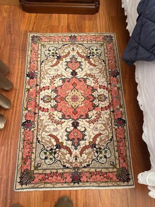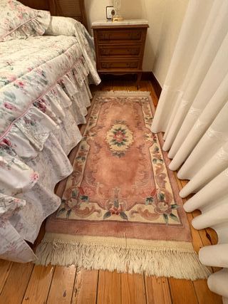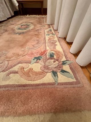 Vendo preciosa alfombra estilo chino de pura lana gruesa con diseño tallado (efecto relieve/esculpido). Características: Medidas: 160 cm de largo x 88 cm de ancho (ideal como pie de cama grande, pasillo ancho o entrada). Material: Lana de alta densidad, muy suave y mullida a la pisada. Diseño: Motivos florales clásicos en relieve sobre fondo color salmón/rosa pastel con bordes en crema y detalles en gris azulado. Estado: Vintage en buen estado de conservación. Mantiene bien el color y el grosor del pelo. Flecos de algodón originales. Perfecta para dar un toque elegante y cálido a un dormitorio o salón clásico.