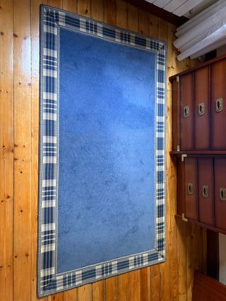 Alfombra de lana de tamaño mediano con un diseño de borde a cuadros. - Color principal azul marinero. - Borde con patrón a cuadros en tonos azul y beige. - Material de lana y tela. NOTA: tiene una pequeña mancha difícil de sacar.