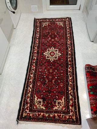 Dos alfombras de pasillo con un diseño clásico. - Motivos florales en tonos beige y rojo. - Borde decorativo. - Flecos en los extremos. Juegos de alfombras. Pasilleras miden 150 largo 70 ancho La del hall mide largo 150 y ancho 100 Se vende el juego completo o por separado Regalamos una mas pequeña