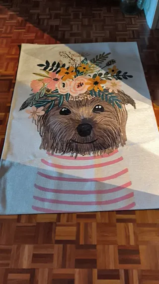 Alfombra con un simpático diseño de perro con flores y jersey a rayas. - Medidas: 115 cm de ancho x 165 cm de largo.