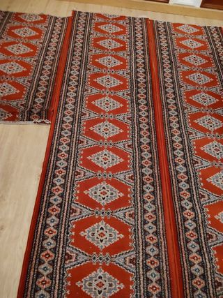 Alfombras de estilo vintage con un vibrante diseño en tonos rojos y grises. Perfecta para añadir un toque de color y calidez a cualquier espacio. - Diseño geométrico tradicional. Se venden juntas o por separado. Precio por las tres 40€ negociable. Entrega en mano en Cáceres. Precio negociable. Hay tres , medidas aproximadas. Largo 117 cm x Ancho 68 cm. Largo 290 cm x Ancho 68 cm. Largo 265 cm x Ancho 68 cm