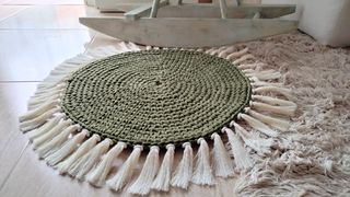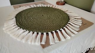 * ALFOMBRA ARTESANAL TEJIDA CON TRAPILLO Y CUERDA DE ALGODÓN. * COLOR VERDE OLIVA OSCURO Y FLEQUILLO BLANCO ROTO/CRUDO. * 45cm DE DIÁMETRO LA PARTE TEJIDA, 60cm CONTANDO EL FLEQUILLO. * MÚLTIPLES APLICACIONES Y OPCIONES DE DECORACIÓN. DE SOBREMESA, ALFOMBRA DE BAÑO, DORMITORIO, PARA DECORAR UN RINCÓN ESPECIAL, INCLUSO PARA COLGAR EN LA PARED. * EL PUNTO ESTÁ BIEN TUPIDO PARA QUE SEA FIRME Y SÓLIDA. * SE PUEDEN HACER OTROS MODELOS POR ENCARGO, CON EL COLOR Y EL TAMAÑO QUE QUIERAS, CON O SIN FLEQUILLO, ETC... (PRECIO EN FUNCIÓN DEL TAMAÑO Y EL TRABAJO). * REGALATE UNA PIEZA ÚNICA 100% HECHA A MANO! * MÁS COSAS EN MI PERFIL.