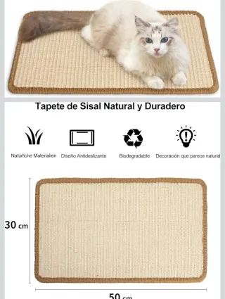 Alfombra rascador para gatos, ideal para que tu mascota afile sus uñas y se divierta. - Material de yute resistente. - Borde de tela marrón.