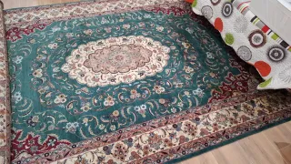 Elegante alfombra de Pakistán, tejida a mano con gran detalle. - Diseño intrincado con motivos florales. - Tonos predominantes de verde azulado y detalles en rojo. - Elaborada con lana de alta calidad, 100% a mano. - Comprada en el Corte Inglés.