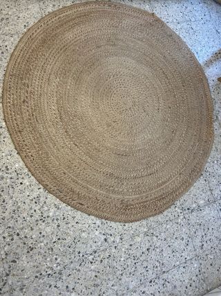 Alfombra de yute grande para sofá con un diseño tejido en espiral. Aporta un toque natural y cálido a cualquier espacio. - Material: Yute - Color: Beige y marrón