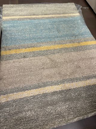 Alfombra de pelo medio con un diseño de rayas en tonos azules, amarillos y grises. - Medidas: 160x230 cm. - Diseño de rayas. Acabada de recoger de la tintorería. Se entrega embalada según la han entregado de la tintorería.