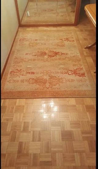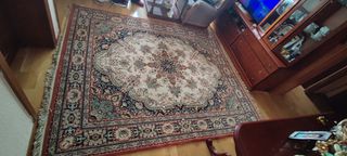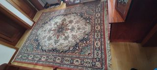 Se vende alfombra de lana salón de 2,40x1,70 comprada en tienda especializada en alfombras de lana, esta recién traída de la tintorería con bonitos dibujos de las de toda la vida. Es en tonos azules esta es igual pero en beig y tostado la otra tiene flecos pero se pueden quitar si se quiere.