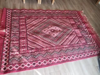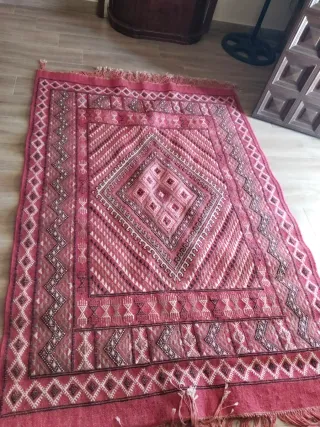Urge venta de alfombra tunecina de lana con un diseño geométrico llamativo en tonos rosas y rojos. Perfecta para añadir un toque de color y calidez a cualquier estancia. - Elaborada con lana de alta calidad. - Patrón central de rombos y bordes decorativos. - Flecos en los extremos. Certificado calidad año 2004 Medidas 213xm x 140 cm