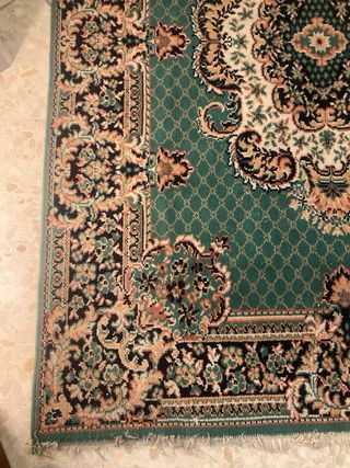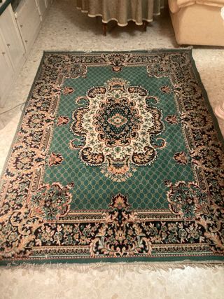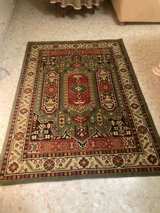 Elegante alfombra de estilo clásico, perfecta para añadir un toque de distinción a tu hogar. Su diseño intrincado y sus colores vibrantes la convierten en una pieza central. - Diseño floral detallado. - Bordes ornamentados. - Patrón central ovalado. Alfombra de 210 × 160 cm, tonos verde/rojo/dorado con medallón central y cenefa floral. Muy decorativa y cálida, ideal para salón o despacho. Buen estado general, colores vivos. Se vende por cambio de decoración. Recogida en mano. Precio: 99 €
