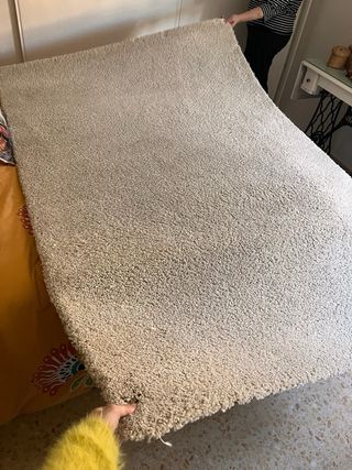 Alfombra de pelo largo en color beige, con unas medidas de 2 metros por 1.35 metros. Se encuentra en perfecto estado, sin haber sido utilizada. - Material: tela - Medidas: 2,00m x 1,35m.