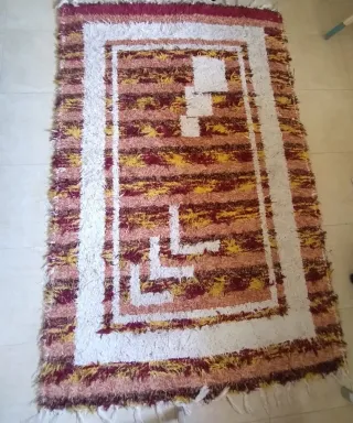 Auténtica alfombra bereber hecha a mano, con un vibrante diseño que aporta un toque de color y tradición a cualquier espacio. - Diseño geométrico tradicional. - Elaborada con lana de alta calidad.