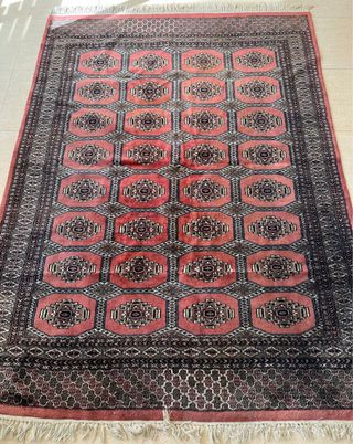 Alfombra oriental auténtica tipo Bokhara Tekke, hecha a mano en Pakistán (años 80–90). • Medidas: 200 × 140 cm • Técnica: nudo turco (Ghiordes) • Materiales: lana natural sobre urdimbre de algodón • Colores: fondo asalmonado con motivos geométricos en negro, gris y azul • Estado: excelente, limpia y sin daños Es una pieza artesanal de alta calidad (aprox. 180.000 nudos/m²), ideal para decoración clásica o boho. Se entrega bien cuidada y lista para colocar.