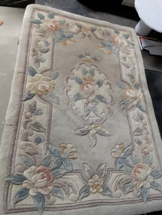 Pequeña alfombra con un bonito diseño floral.Los colores en la fotos se ven más brillantes de lo que son en realidad, - Colores beige y multicolor. - Fabricada en tela y lana.