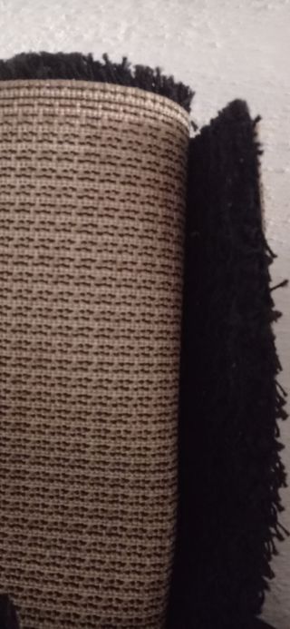 Alfombra de tela enrollada, lista para ser transportada o almacenada. - Textura suave y mullida. - Diseño moderno.
