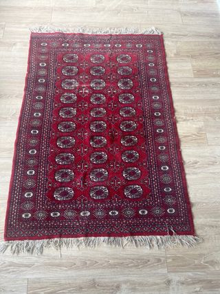 Preciosa alfombra roja vintage, ideal para añadir un toque de calidez y estilo a tu hogar. Es una pieza única con un diseño clásico. - Confeccionada en lana de excelente calidad - Medidas aproximadas: 1.80 x 1.25m (Por favor, revisa las fotos para confirmar). - Presenta un leve desgaste, propio de su antigüedad y uso, que le da un encanto especial. Necesita un lavado