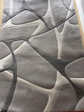 Preciosa alfombra de poliéster, en tonos beige y gris. Es una pieza elegante y moderna, ideal para cualquier habitación. - Diseño geométrico con detalles decorativos. - Perfecta para añadir calidez y estilo a tu hogar. - En muy buen estado.