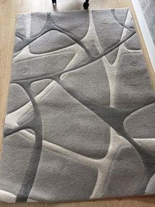 cuatro alfombras de diferente diseño y dimensiones 1) beige y geométrico 170x120. precio 75€ 2) blanco y negro abstracto 220x145. precio 35€ 3) gris pelo 250x165. precio 30€ 4) jaspeada grises nueva 210x155. precio 99€