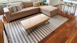 Alfombra de salón con un diseño de rayas en tonos beige y gris. Sus dimensiones son 3x2 metros. - Tejido liso y agradable al tacto. - Diseño de rayas verticales. - Recien lavada y embalada
