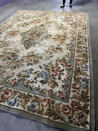 Elegante alfombra con un diseño floral clásico. - Confeccionada en lana pura. - Tonos suaves en beige y verdes claros - Falta pasar x el tinte y quedara como nueva