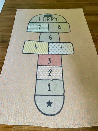 Alfombra de juego con diseño de rayuela, perfecta para habitaciones infantiles. - Diseño de rayuela con números del 1 al 8. - Incluye la palabra HAPPY y un pequeño dibujo de nubes en la parte superior. - Base de tela con estampado de pequeños puntos en tonos pastel. - Lavable en lavadora.