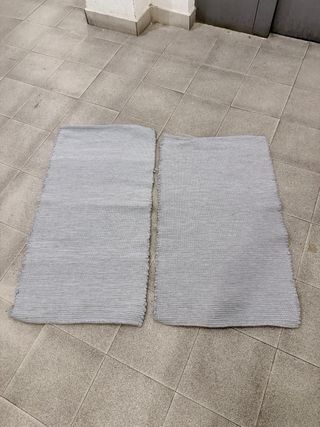 Conjunto de dos alfombras de lana en tono gris topo. 20€ cada una - Medidas: 150 cm de largo x 80 cm de ancho cada una. - Material: Lana y tela.