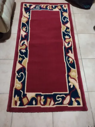 Alfombra de lana con un diseño tradicional y elegante, perfecta para pasillos. - Diseño con motivos vegetales y geométricos. - Tonos rojos y beige que combinan fácilmente. - Material de lana para mayor durabilidad y confort. Hace falta limpiar.