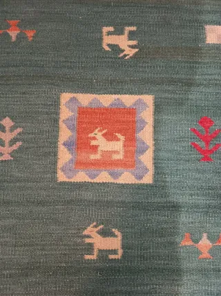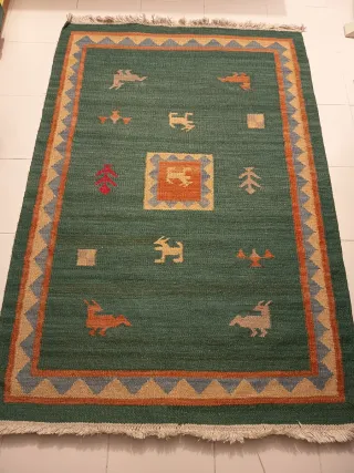 Alfombra de lana en un bonito tono verde oliva. Aporta calidez y textura a cualquier espacio. En buen uso. De un único color, tiene diferentes zonas por la labor del tejido. Tiene los tres puntos marcados por la mesa que se ve en las fotos, pero parece que se irá con otro uso. Se vende solo la alfombra, no la mesa ni otros elementos de la foto. - Tacto suave y agradable. - Diseño moderno y versátil.