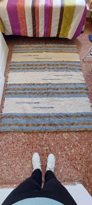 Alfombra con un diseño de rayas en tonos beige y azul. Su textura la hace acogedora. - Diseño de rayas horizontales. - Textura suave y agradable al tacto.