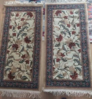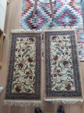 Conjunto de dos alfombras de estilo persa con un diseño floral. Muy bonitas y de calidad.Se venden también por separado. MEDIDAS: 1,20*60cm NO HAGO ENVÍOS. - Motivos florales en tonos rojos y beige. - Borde decorativo con detalles en azul y rojo. - Flecos en los extremos.