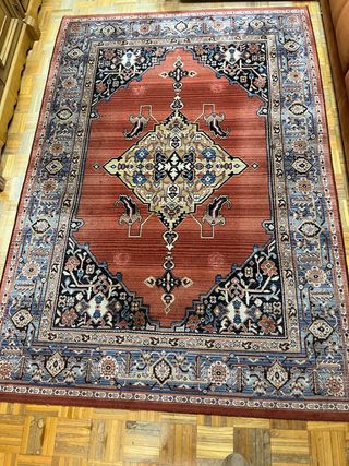 Bonita alfombra de lana con un diseño llamativo. - Medidas: 1.80 metros de ancho por 2.40 metros de largo. - Colores principales: azul y rojo. - Material: lana.