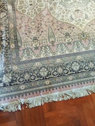 Preciosa alfombra de lana en tonos verdes y beige. Es una pieza elegante y delicada, ideal para añadir un toque de calidez a cualquier espacio. Fácil de combinar y limpiar. Tiene algo desgastadas un par de esquinas. - Diseño clásico con un bonito marco. - Perfecta para salón o dormitorio. - Mide 140*190 cm