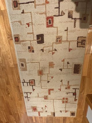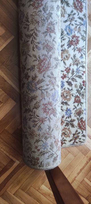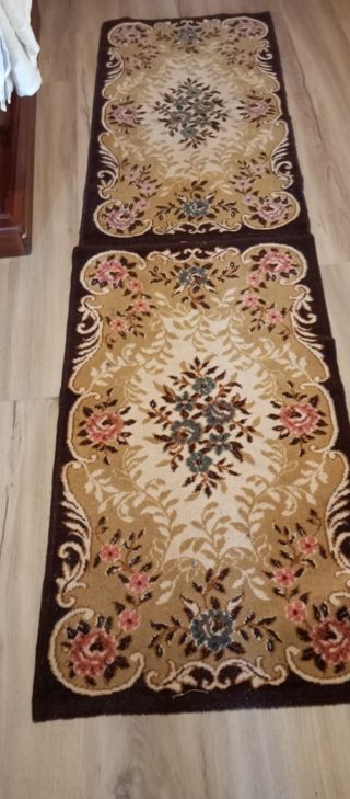 Dos alfombras años 60. Medidas 1'35x68 cms. Una conserva la etiqueta de la tintorería. Han estado guardadas desde hace pocos años. Están bien conservadas. Marcas normales por antigüedad. No tienen roturas, ni agujeros ni polilla. Para pie de cama, pasillo, pequeño hall, centro de mesita cuarto de estar... También recogida en mano. Aspiradas, así y todo tendrán algo de polvo.