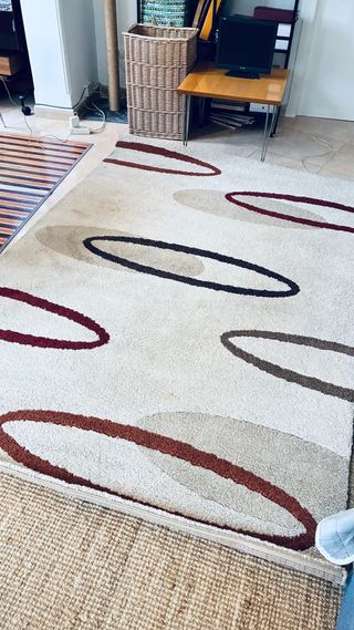 Alfombra de lana virgen con un diseño moderno de óvalos en tonos beige y marrón. Su textura suave la hace muy agradable al tacto. - Material: lana virgen. - Colores: beige y marrón, crema y burdeos Fabricada en España en muy buen estado de conservación poco uso