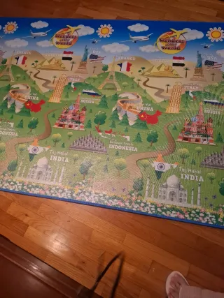 Alfombra educativa con un mapa del mundo para que los niños aprendan sobre diferentes países y monumentos. - Diseño colorido con monumentos famosos. - Borde decorativo con flores y mariposas.