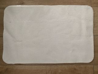 Alfombra de baño suave y cómoda, perfecta para añadir un toque acogedor a tu baño. - Medida : 102 x 65 cm - Antideslizante. - Textura mullida. - Diseño moderno. Sin estrenar. Tiene la goma de atrás amarillenta de la doblez al estar guardada.