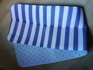 Alfombra rectangular con un diseño de rayas azules y blancas muy suave al tacto. Su tamaño es de 1,40 metros por 39 centímetros. - Tejido muy suave. - Diseño de rayas verticales.