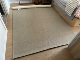 Alfombra de tejido en color beige. - Textura tejida. - Diseño sencillo y versátil. -Uso mínimo. -Tiene una mancha amarillenta en un lateral.