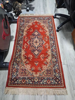 Alfombra de lana con un diseño intrincado y colores vibrantes. - Patrón central geométrico. - Bordes decorativos. - Motivos florales y de aves. - Textura suave. - Medidas: 154x113cm. - Recogida en Valldoreix. Acepto ofertas coherentes.