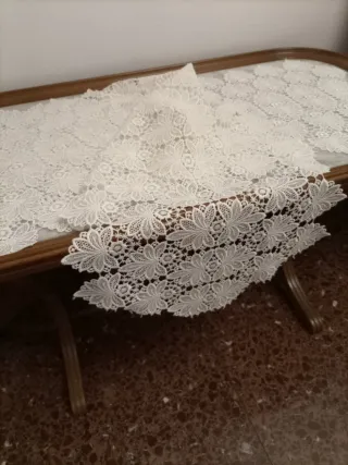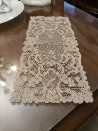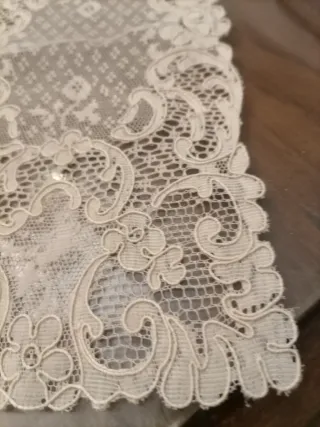 Elegante tapete vintage con un intrincado diseño de encaje. - Color beige. - Material de tela. - Diseño floral y ornamental.