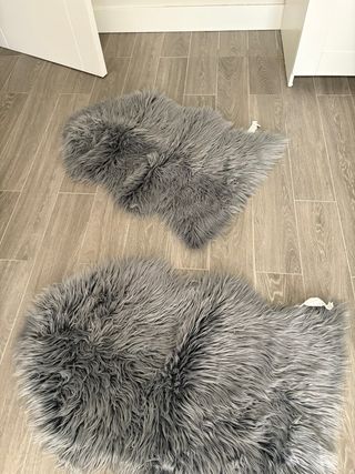 Dos alfombras de pelo sintético, color gris. Son suaves y esponjosas, ideales para añadir calidez a cualquier habitación. - Perfectas para dormitorios o salas de estar. - Se encuentran en buen estado.