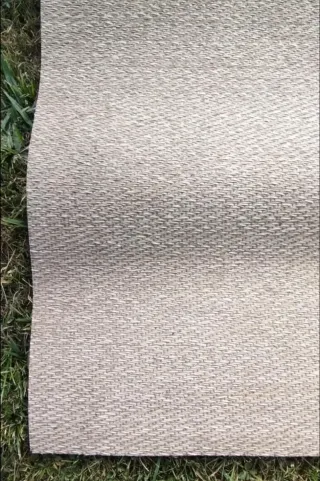 Alfombra de tela en tonos beige y gris, con un diseño tejido. - Medidas: 2 metros de largo por 1.40 metros de ancho. - Textura agradable al tacto.