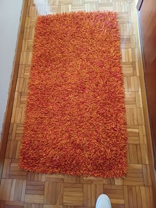 Alfombra de fibras suaves en tonos naranjas y rojizos. Rectangular; medidas aproximadas: 1.30m x 0.70m