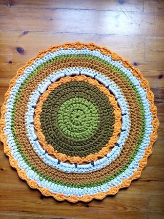 Bonita alfombra 100% artesanal. Ideal para dormitorio, pasillo, rincones, etc.. Colores divertidos. 65cm de diámetro. Puedes mirar más opciones en mi muro