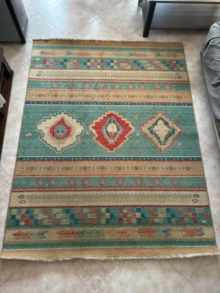 ¡Precios tan bajos que hasta mi mudanza se sorprende! 🏃♂️💨" Alfombra de alta calidad 100% lana con un diseño étnico vibrante y llamativo. Sus colores y patrones la hacen una pieza central para cualquier estancia. Me costó en su momento 300€. - Diseño geométrico y tribal. - Tonos tierra y turquesa predominantes. - Tacto agradable.